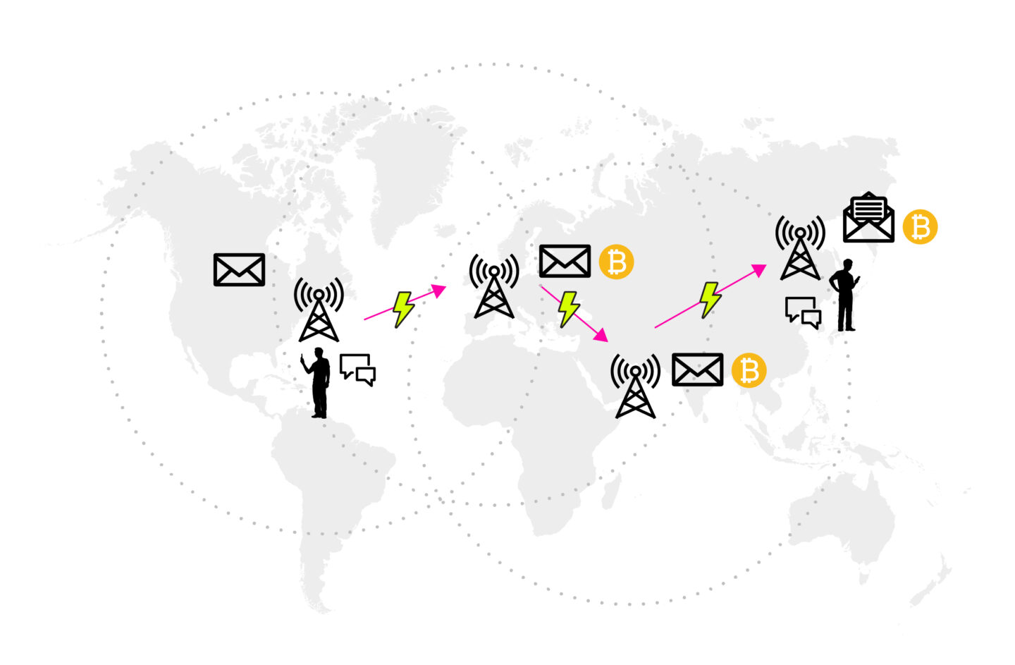 A key requirement for making offline-only Bitcoin use cases viable is to replace the need for centralized last-mile access to the internet with a system capable of sending data, independent of the physical distance it needs to travel. It may be slower to send data halfway around the globe compared to within a city, but in both cases should use the same equipment and infrastructure.