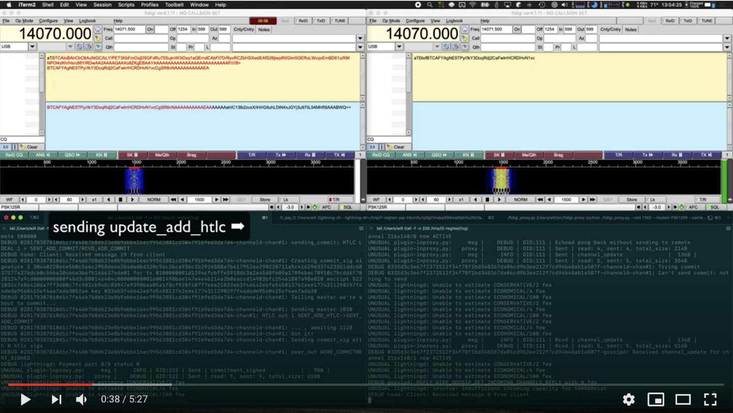 For comparison, this is half the time it would take for a Bitcoin transaction with an above-average fee to be included in a block, and the recipient would still want to wait for a few more blocks before considering the transaction final. With fldigi-proxy and lnproxy, offline Bitcoin users can use Lightning channels for fast payments on a medium more censorship-resistant and decentralized than the public Internet or Tor.